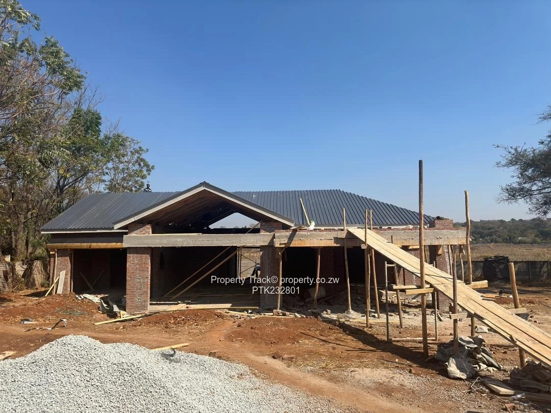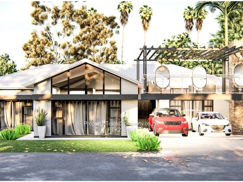 Garden flat for sale in Mandara, Harare East — a modern family home on a secure 550 m² stand with a 200 m² footprint. This bright single-level design offers 4 generous bedrooms and 5 bathrooms, open-plan living with floor-to-ceiling glazing and a seamless indoor-outdoor flow onto a private garden and tiled swimming pool. As seen in the images, the contemporary façade features a pitched roof, glazed gable and an elevated pergola terrace perfect for entertaining; a covered double carport sits beneath the deck. The property benefits from its own borehole for reliable water supply and full boundary walls for privacy and security. Current photos include both architectural renders illustrating the finished look and site progress shots showing solid brickwork and structural completion — an excellent opportunity to complete finishes to your taste or move in once final works are done. Ideal as a family home or high-yield rental in a sought-after Harare East neighbourhood. Contact us to arrange a site visit and view the plans.
